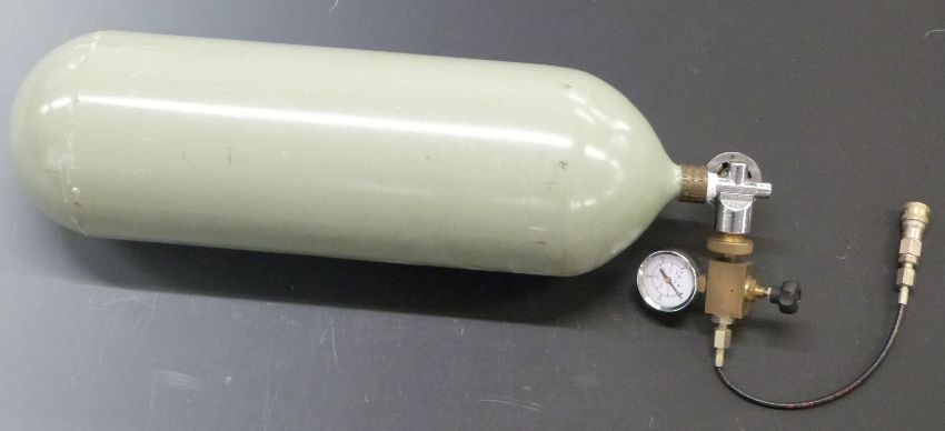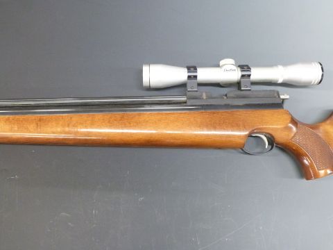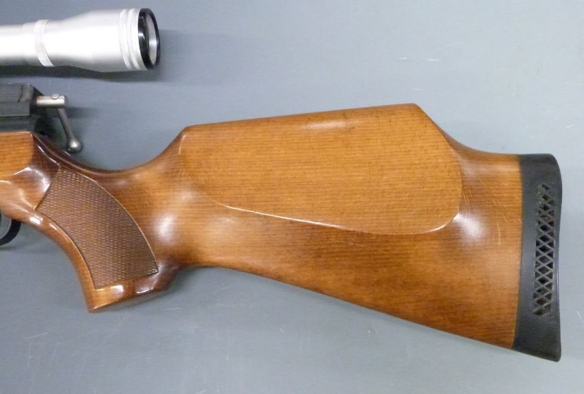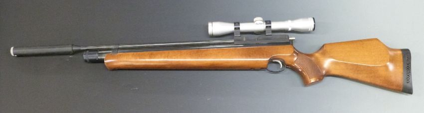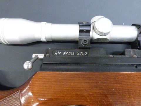 Air Arms S300 .22 PCP air rifle with chequered semi-pistol grip, raised cheek piece, sound moderator, Simmons Deer-Field 31006 4x32 scope and compressed gas storage bottle, serial number 5264.