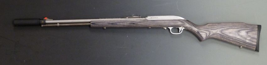 Marlin model 60SS .22 LR bolt action rifle with show wood stock, semi-pistol grip, sling mounts, Riflecraft Hardy sound moderator and 23.5 inch barrel, overall length 107cm, serial number MM76292K. PLEASE NOTE THAT A VALID RELEVANT FIREARMS/SHOTGUN CERTIFICATE IS REQUIRED TO HANDLE/PURCHASE THIS ITEM.