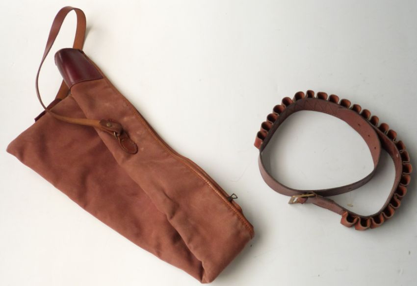 Canvas and leather wool lined gun slip with shoulder strap and a brown leather 12 bore shotgun cartridge belt.