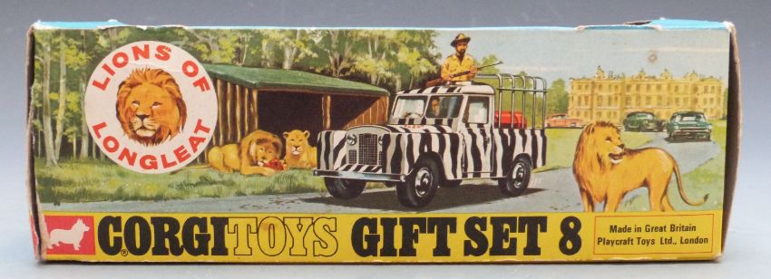 Corgi Toys diecast model Gift Set No.8 Lions of Longleat with Land Rover, Protection Cage, Water Tank, White Hunter, Lions Den, Pride of Lions and Meat, in original box,