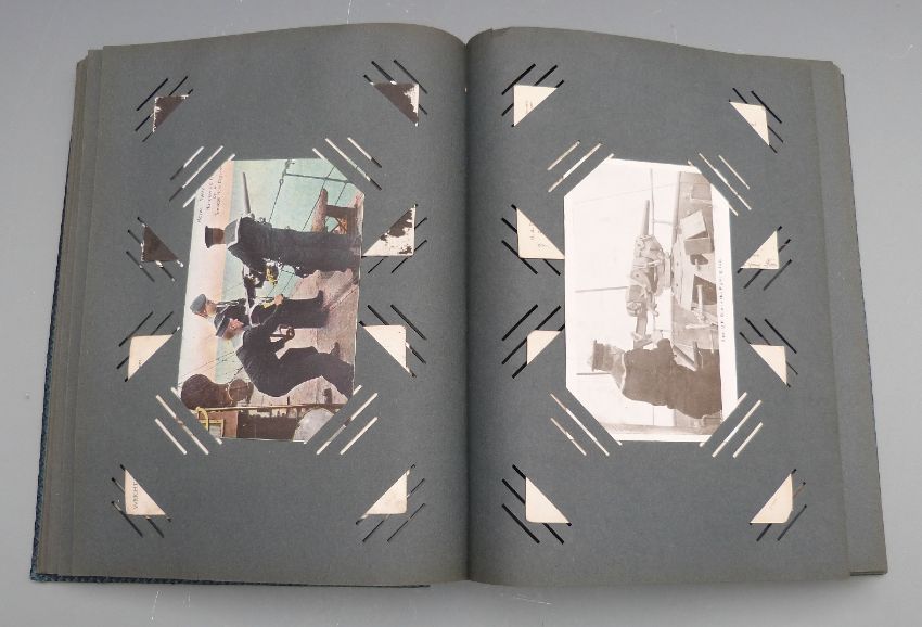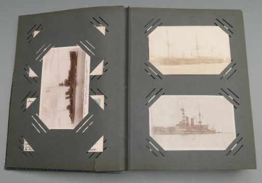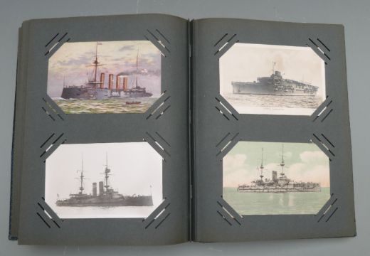Royal Navy postcard album with over 100 cards from WWI through to the Cold War, some in colour includes HMS Nelson, HMS Rodney, HMS Warspite etc