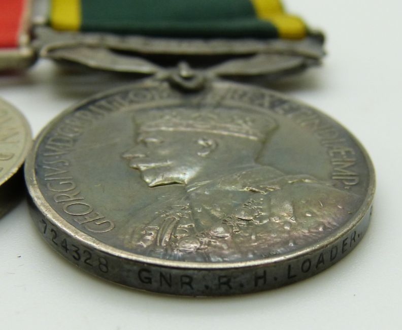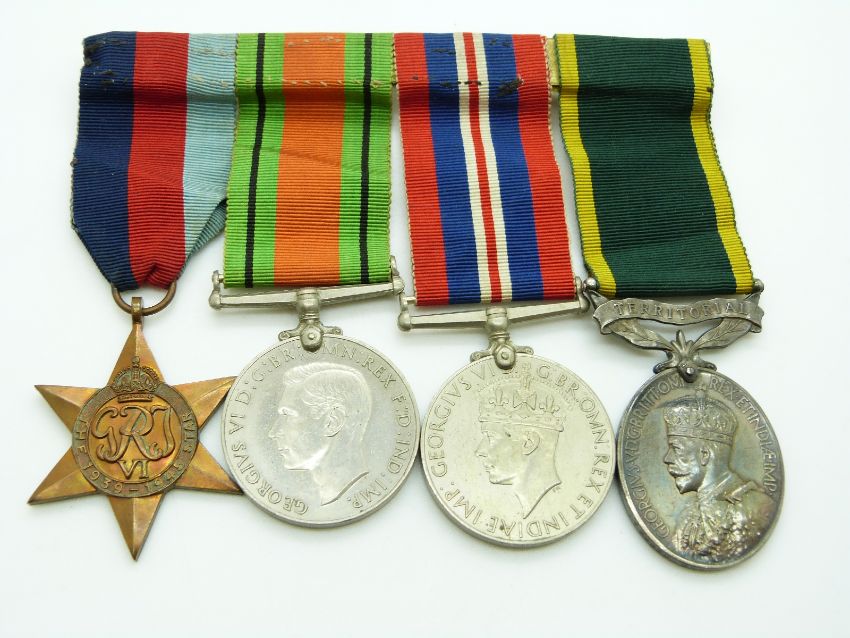 British Army WWII medals comprising 1939/1945 Star, Defence Medal, War Medal and Territorial Efficiency Medal named to 724378 Gunner R H Loader, Royal Artillery