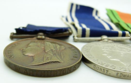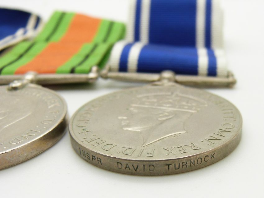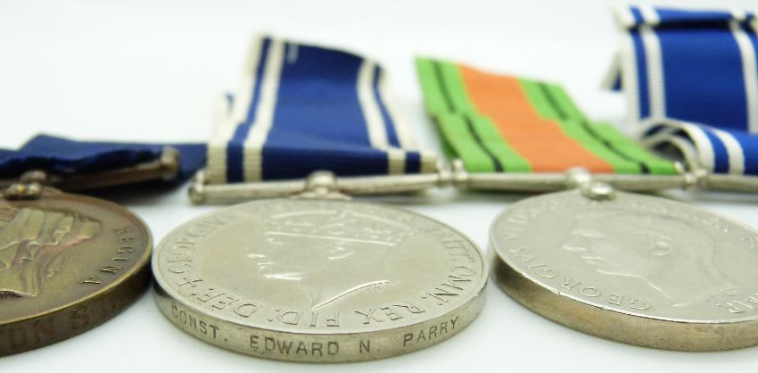 Two Police Long Service & Good Conduct medals (George VI) for Inspector David Thurnock and Edward Parry with his WWII Defence Medal and a Metropolitan Police Jubilee Medal (1887) named to PC W Arthurton SD