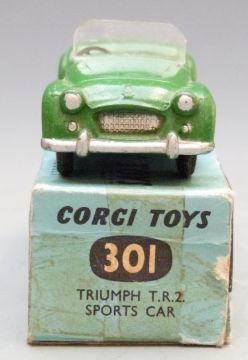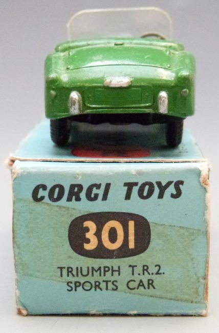 Corgi Toys diecast model Triumph T.R.2 Sports Car with green body and cream interior, 301, in original box.