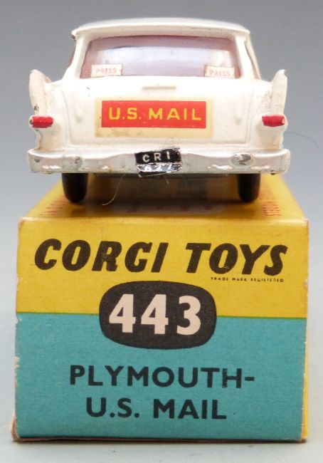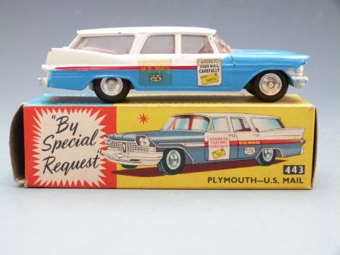 Corgi Toys diecast model Plymouth - U.S. Mail with blue and white body, red stripe, decals and red interior, 443, in original box.