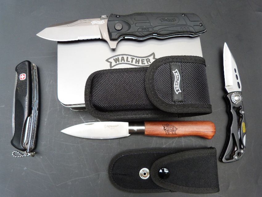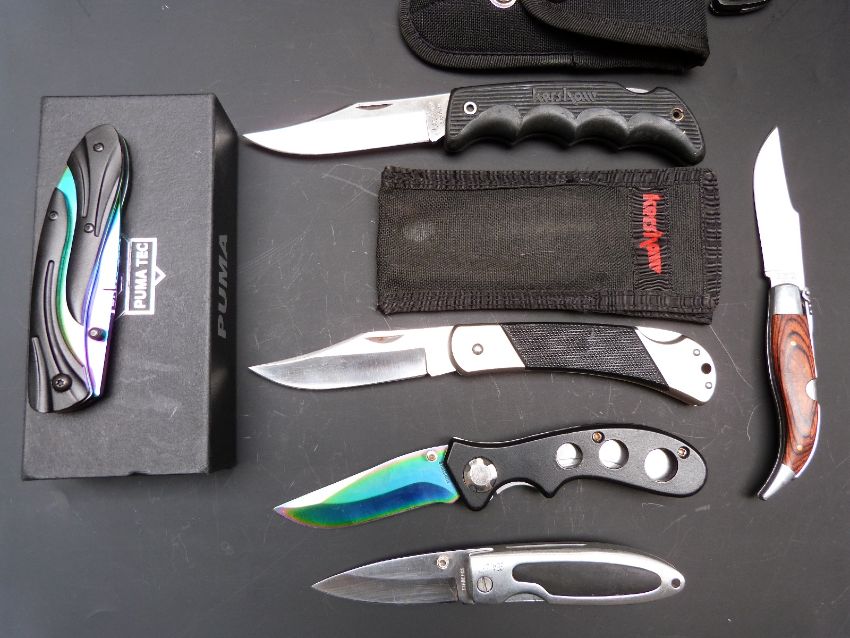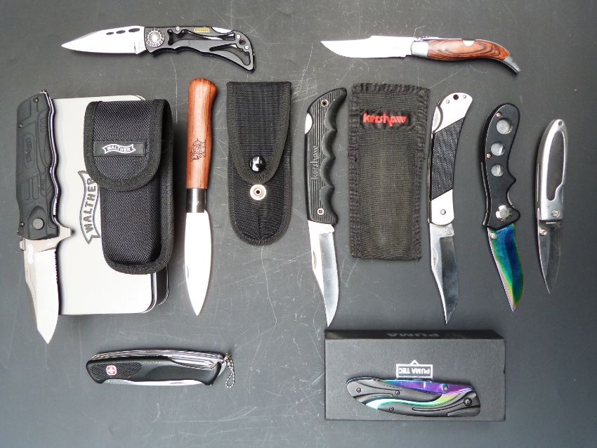 Ten pocket knives including Wenger, Kershaw, Stanley and Walther