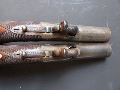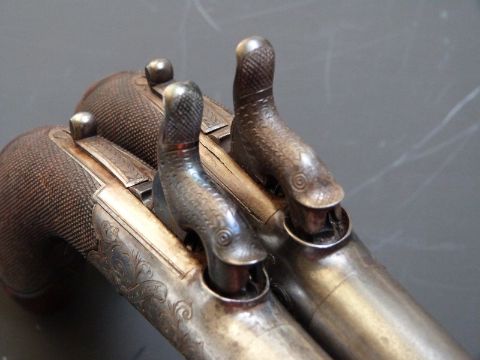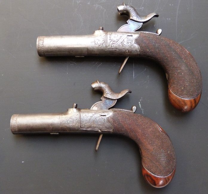 A pair of Forsyth & Co percussion hammer action pocket pistols with named and finely engraved locks, folding triggers, stylized dolphin hammers, chequered walnut grips, thumb slide safeties, vacant wrist cartouches and engraved 1.75 inch turn off barrels, overall length 15cm.