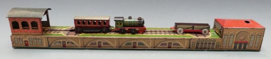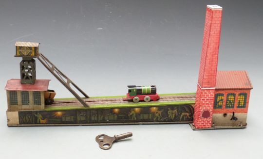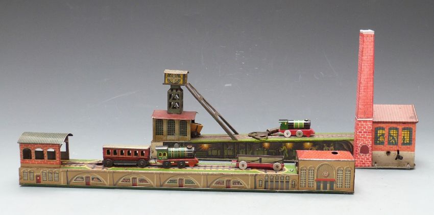 Two Arnold clockwork tinplate railways, one in the form of a coal mine with engine shed, the other in the form of a train station and engine shed modelled on Stuttgart train station, largest 37.5cm long.
