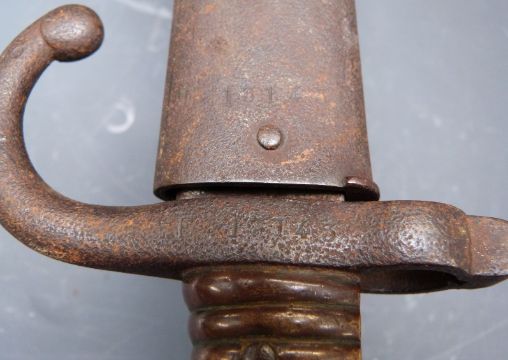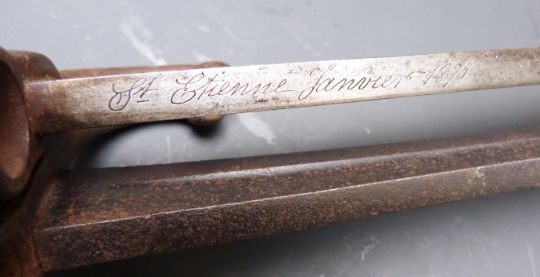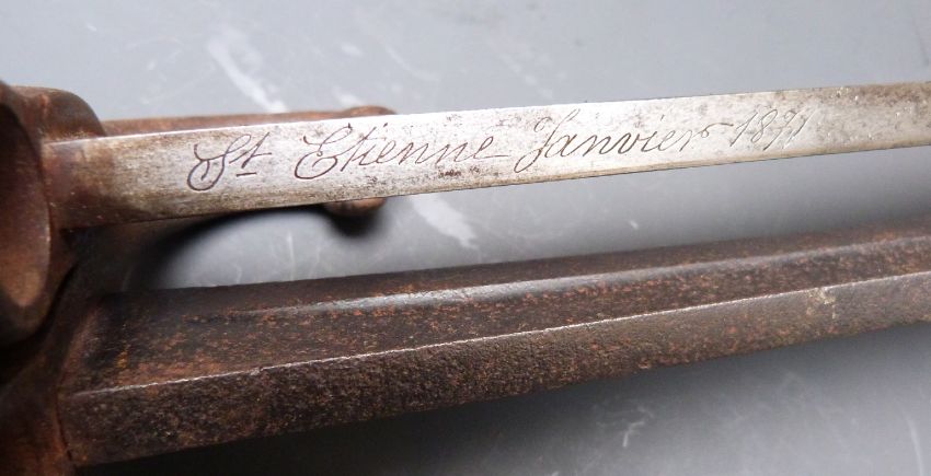 Two French Army 1866 pattern bayonets with yataghan 57cm blades one with scabbard, one named St Etienne 1871