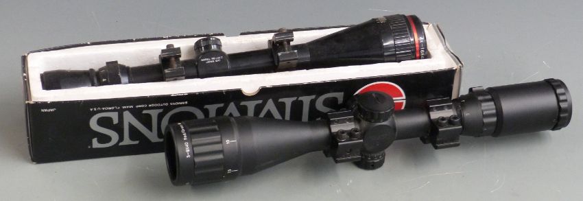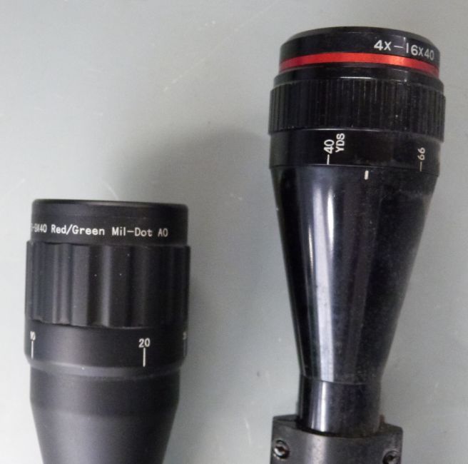 Two rifle scopes, one Simmons 4-16x40 in original box, the other 3-9x40 red/green mil-dot AO.