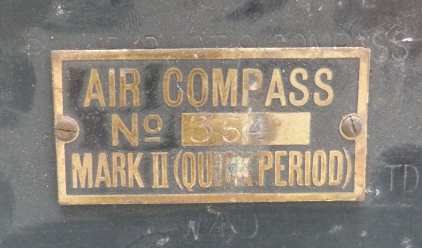 Circa WWII air compass No 354 Mark II (quick period), with markings behind plate reading RAF pilots compass