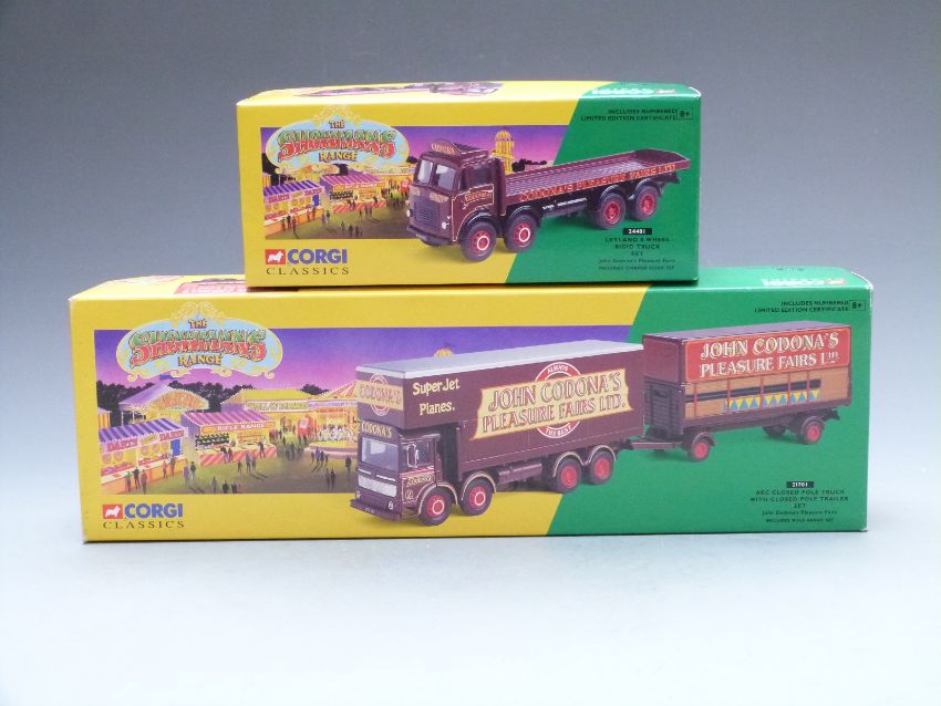 Four Corgi The Showman's Range diecast model vehicles comprising Anderson & Rowland's Scammell Highwayman Generator with Closed Pole Trailer & Dodgem Trailer Set 15901 and Atkinson Open Pole Truck Set 27801, John Codona's Pleasure Fairs AEC Closed Pole Truck with Closed Pole Trailer Set 21701 and Leyland 8 Wheel Rigid Truck Set 24401, all in original boxes, two with tissue paper wrapping.