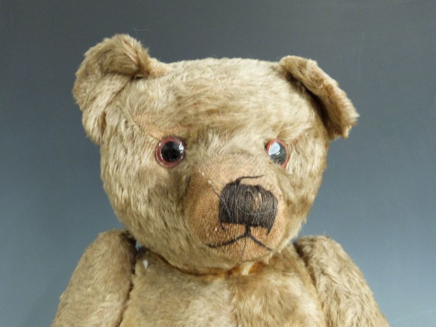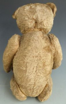 William J Terry or similar English Teddy bear with blonde mohair, straw filling, shaved snout, cocked wrists and feet and humped back, 56cm tall.