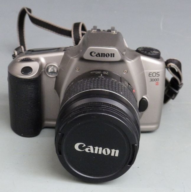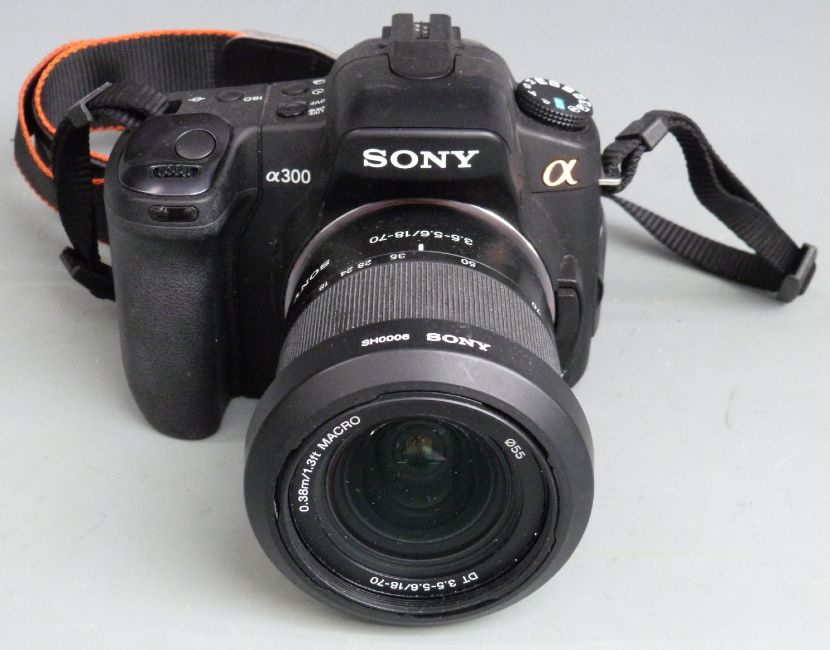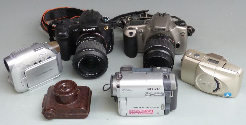 Cameras and accessories to include Canon EOS 3000N with 28-80mm lens, Sony Alpha A300 with 3.5-5.6 18-70 lens, two Sony Handycam video cameras, V.P.Twin bakelite camera etc