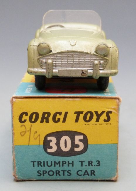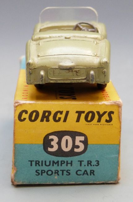 Corgi Toys diecast model Triumph T.R.3 Sports Car with metalic olive green body and red interior, 305, in original box.