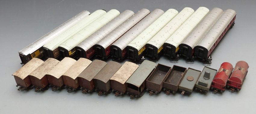 Thirty-four Hornby Dublo and Hornby 00 gauge coaches, wagons, tankers, goods vans and signals, one in original box.