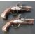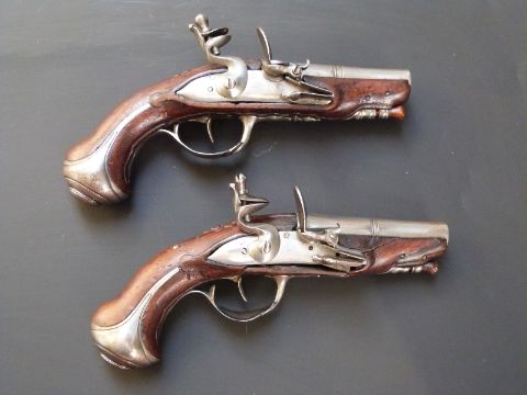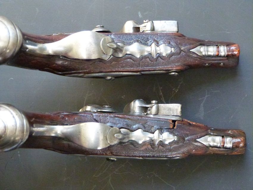 A pair of French flintlock hammer action pocket pistols, the ornately carved stocks decorated with flowers, steel trigger guard, butt plate and mounts, wooden ram-rod and three inch two stage steel barrels, overall length 17cm