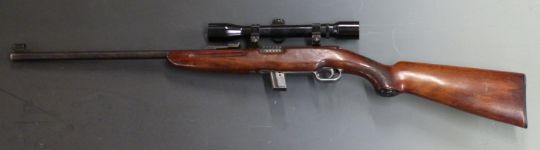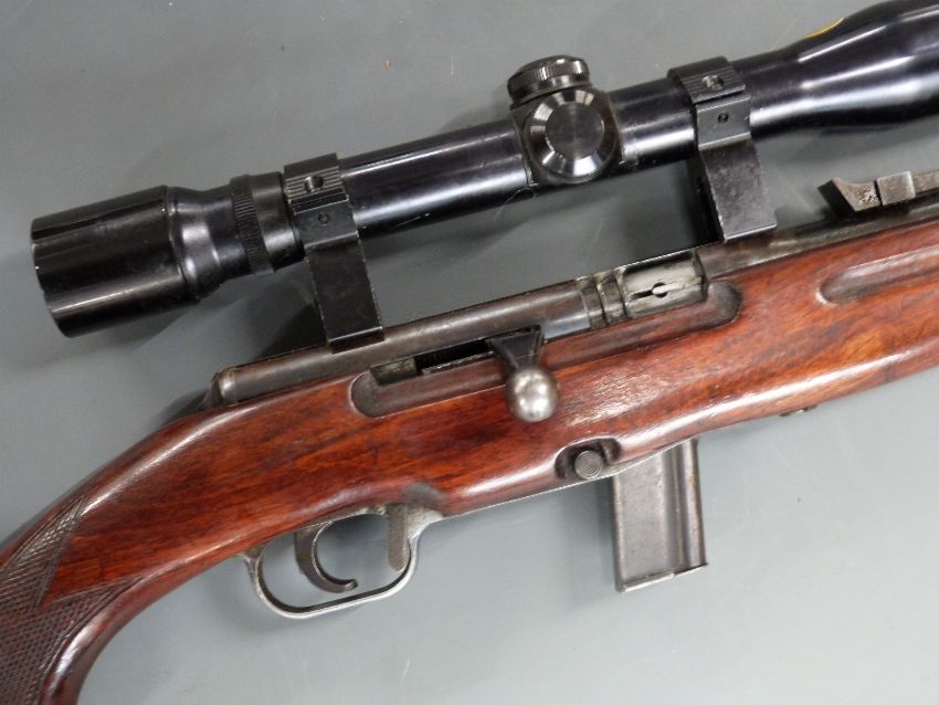 Unnamed French .22 semi-automatic rifle with chequered semi-pistol grip, Hakko 4x32 scope and 20 inch barrel, overall length 99cm, serial number 2883. PLEASE NOTE THAT A VALID RELEVANT FIREARMS/SHOTGUN CERTIFICATE IS REQUIRED TO HANDLE/PURCHASE THIS ITEM.