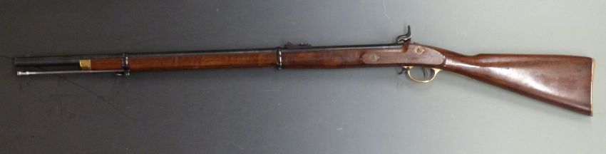 Italian London Armory & Co Enfield pattern .577 2-band percussion hammer action rifle with named lock, brass trigger guard and butt plate, sling suspension loops, pop-up ladder sights and 33 inch rifled barrel, overall length 125cm, serial number 15301. PLEASE NOTE THAT A VALID RELEVANT FIREARMS/SHOTGUN CERTIFICATE IS REQUIRED TO HANDLE/PURCHASE THIS ITEM.