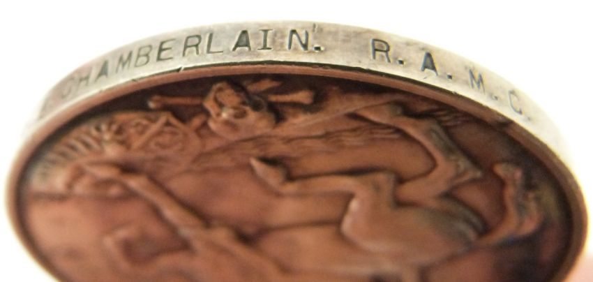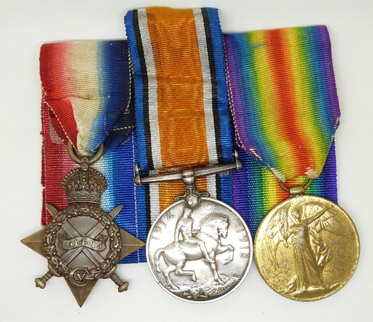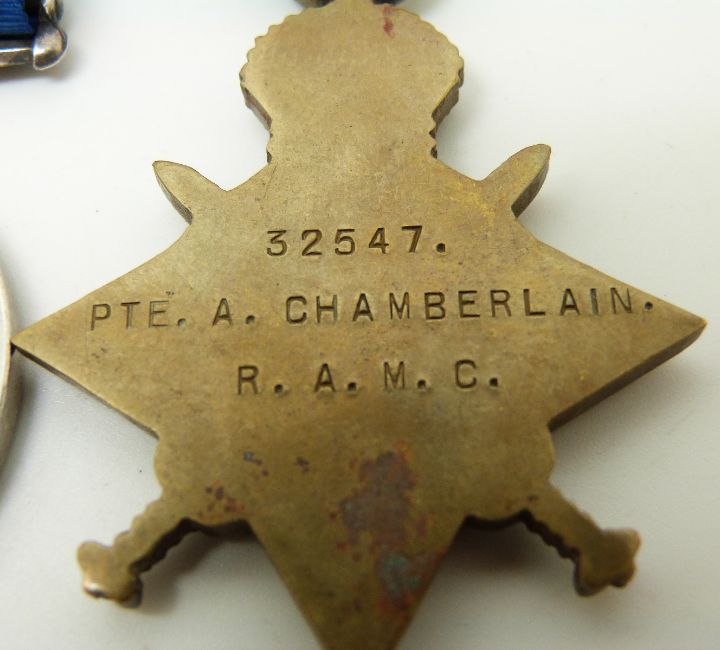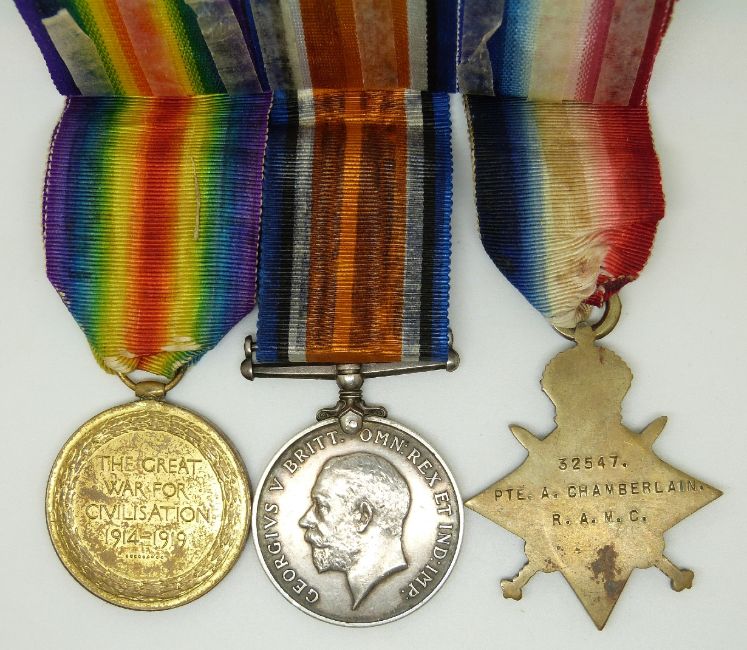 British Army WWI medals comprising 1914/1915 Star, War Medal and Victory Medal named to 32547 Pte A Chamberlain, Royal Army Medical Corps