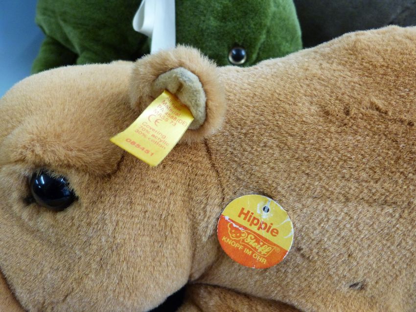 Five Teddy bears comprising three Steiff, Hippie the hippo, Rhino and one other together with two Merrythought Hippos, largest 60cm long.