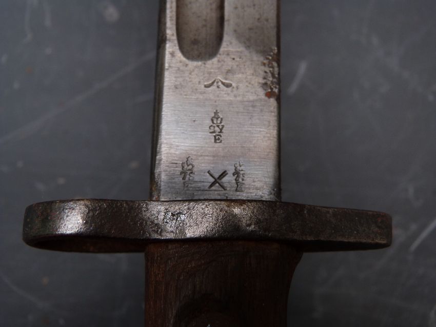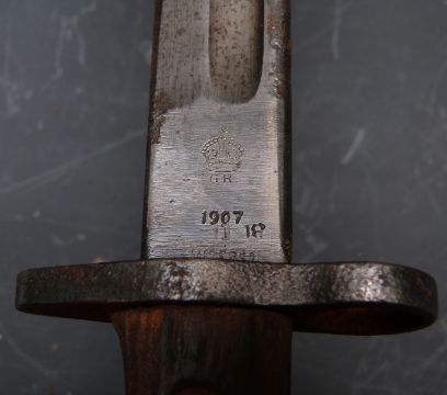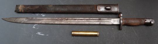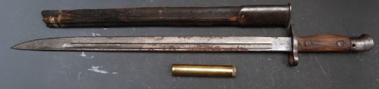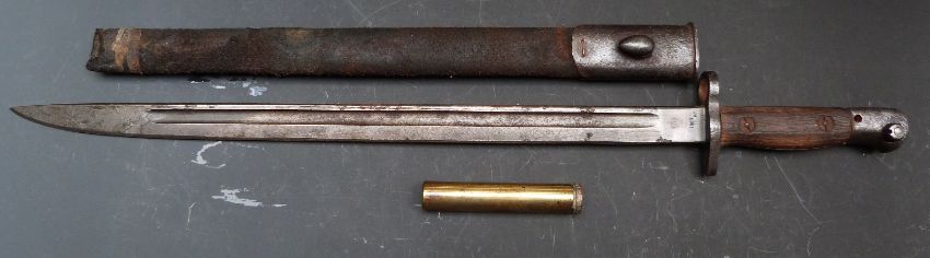 British Army WWI 1907 pattern bayonet, length 43cm together with scabbard and brass oil bottle