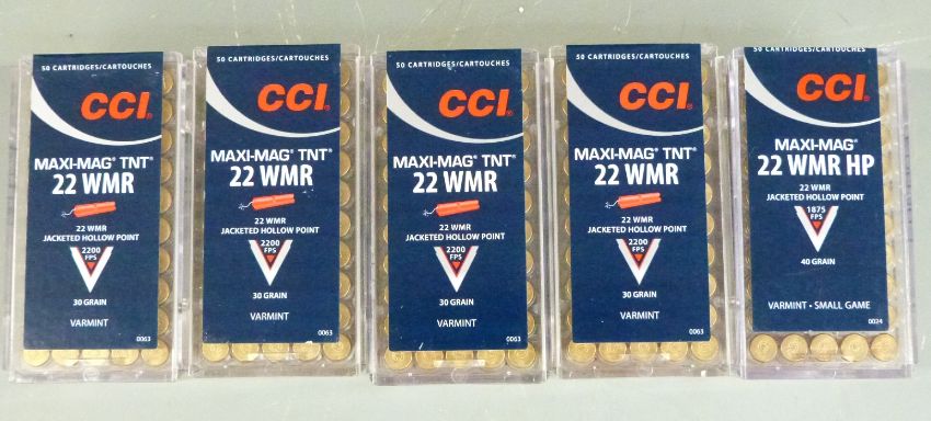 Two-hundred-and-fifty CCI Maxi-Mag .22 WMR HP rifle cartridges, all sealed in original boxes. PLEASE NOTE THAT A VALID RELEVANT FIREARMS/SHOTGUN CERTIFICATE IS REQUIRED TO HANDLE/PURCHASE THIS ITEM.