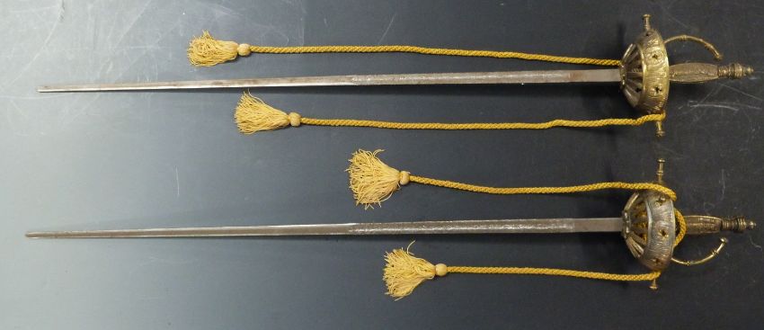 Pair of ceremonial swords with brass handle and guard, blade length 83cm
