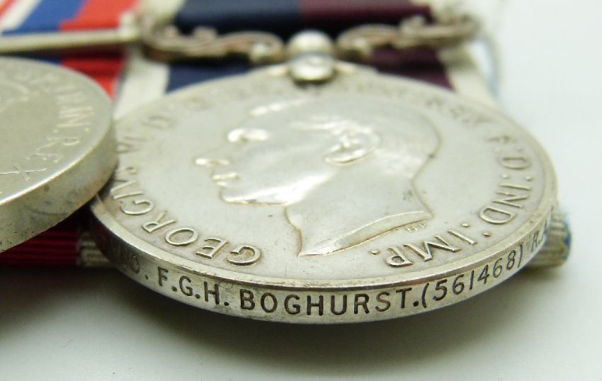 Royal Air Force medal group comprising Indian General Service Medal with clasp for North West Frontier 1936-37 named to 561468 Lac FGH Boghurst, RAF WWII 1939/1945 Star, Africa Star, Defence Medal, War Medal and his Good Conduct & Long Service Medal (Act/WO)