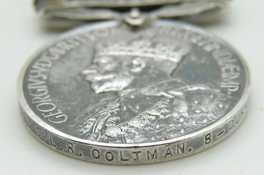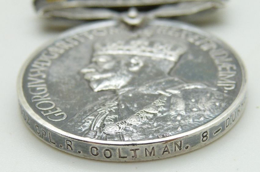 British Army WWII Territorial Efficiency Medal named to 4438032 Cpl R Coltman, 8th Battalion Durham Light Infantry, with POW paperwork