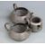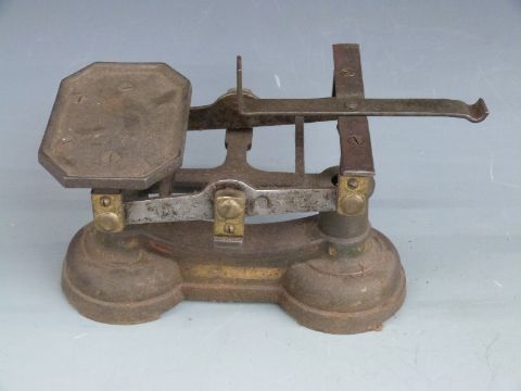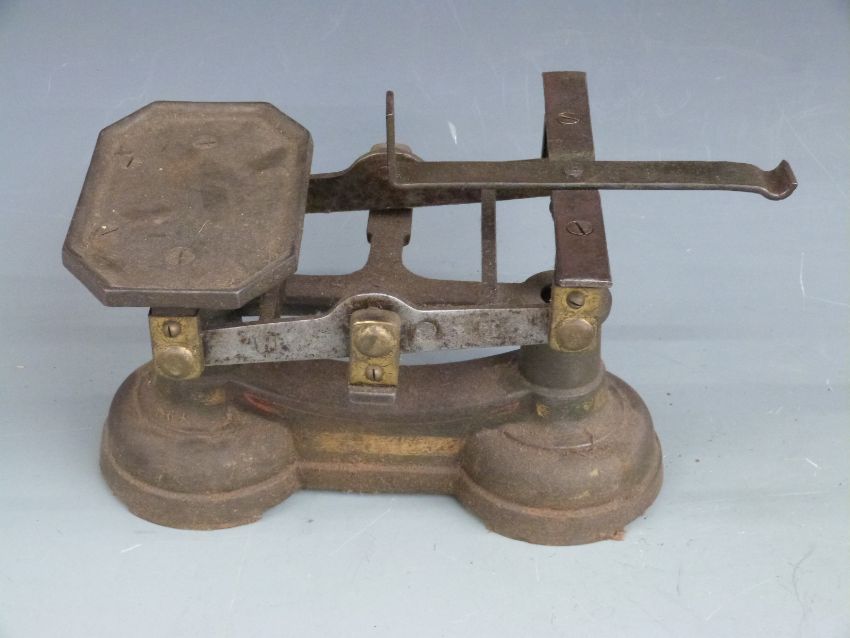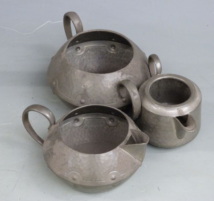 Set of shop or kitchen scales, cased set of weights, leather case and three pieces of Arts and Crafts pewter items