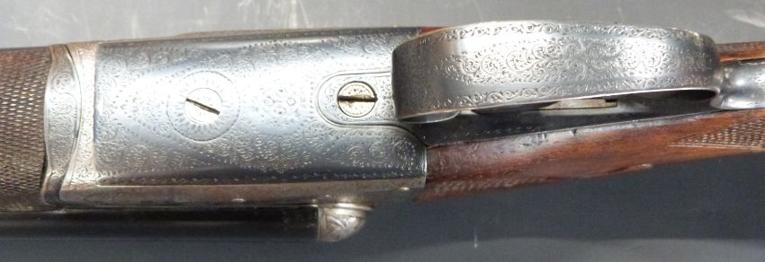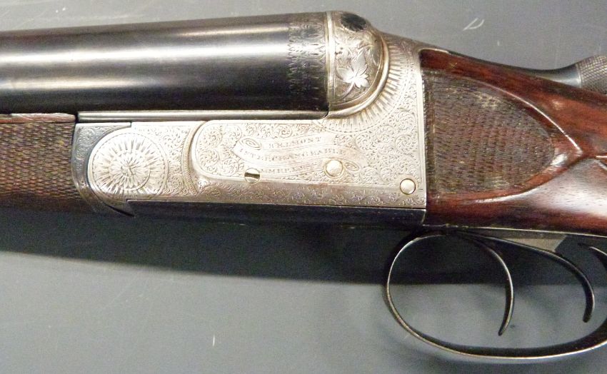 Belmont Interchangable Hammerless 12 bore side by side ejector shotgun with named and engraved lock, engraved trigger guard, underside and top plate, chequered semi-pistol grip and forend, carved teardrop to the wrist, vacant cartouche to the underside of the stock, double trigger and 26 inch barrels, overall length 107cm, serial number 1576N.  PLEASE NOTE THAT A VALID RELEVANT FIREARMS/SHOTGUN CERTIFICATE IS REQUIRED TO HANDLE/PURCHASE THIS ITEM.