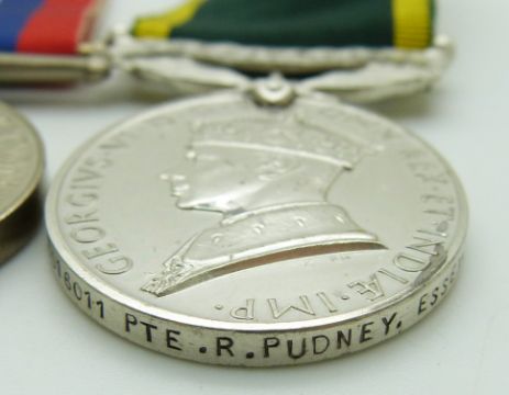 British Army WWII medals comprising 1939/1945 Star, Italy Star, Defence Medal, War Medal and Territorial Efficiency Medal named to 6016011 Pte R Pudney, Essex Regiment