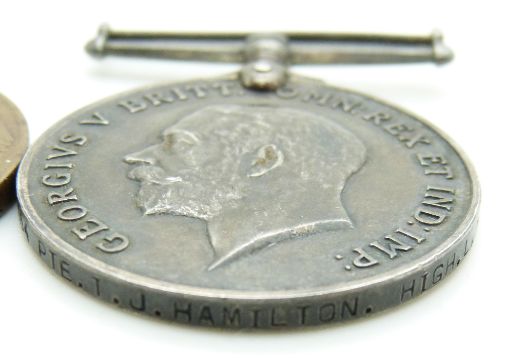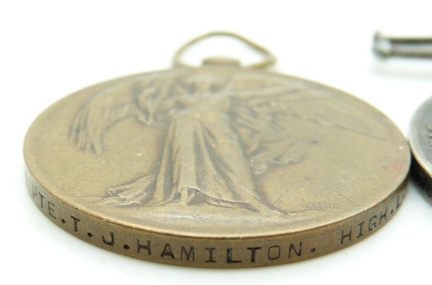 British Army WWI medals comprising War Medal and Victory Medal named to 27084 Pte T J Hamilton, Highland Light Infantry