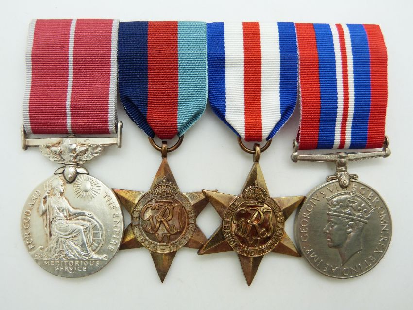 British Empire Medal together with 1939/1945 Star, France & Germany Star and War Medal for 10557918 A/WO Class 1 Thomas P Flattley, Royal Army Ordinance Corps, with Gazettes 21st June 1945, copy paperwork including his citation for the BEM and a Corps walking stick