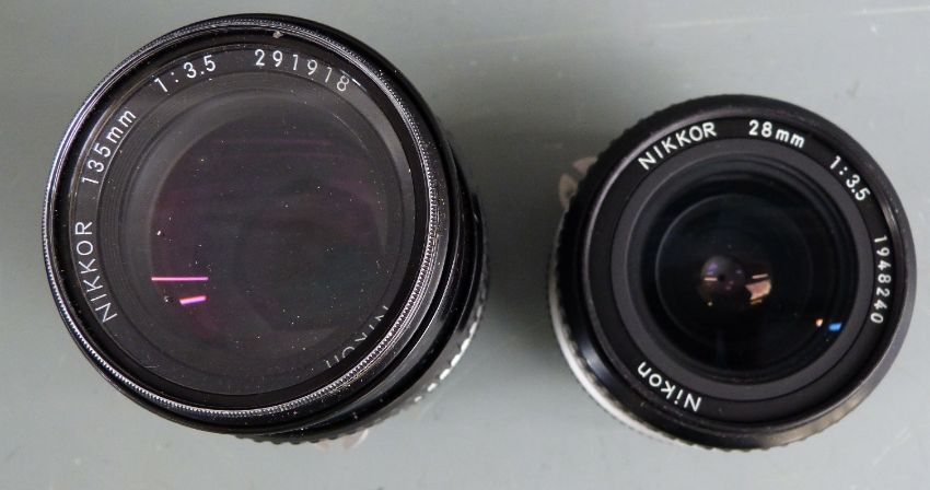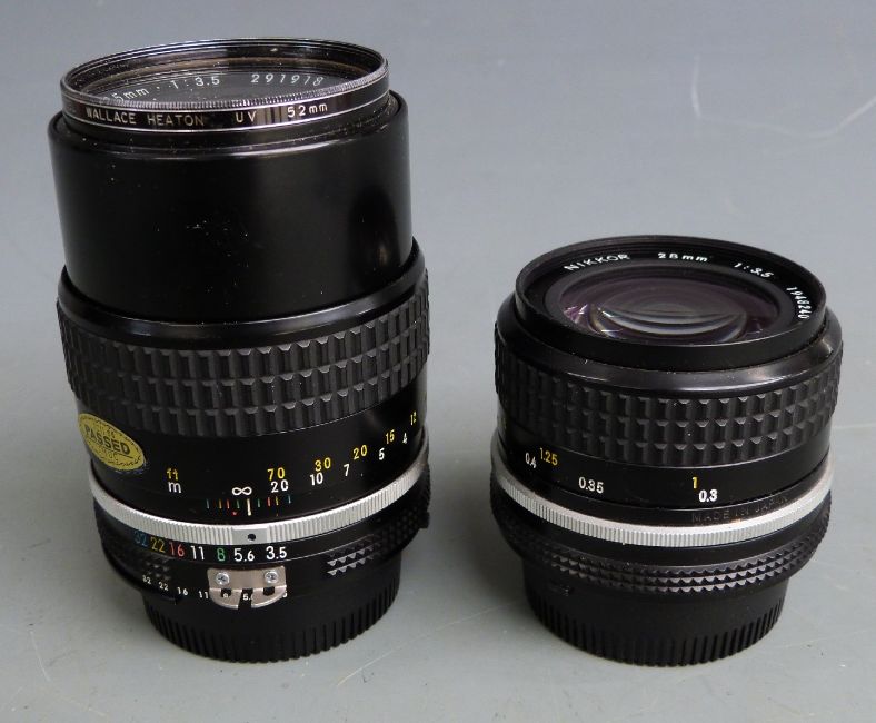 Two Nikon SLR camera lenses comprising Nikkor 135mm 1:3.5 and 28mm 1:3.5