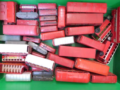 Forty Dinky Toys, Matchbox and similar diecast model Routemaster and similar buses and trams including double decker buses, Exide Batteries, Tern Shirts etc.