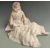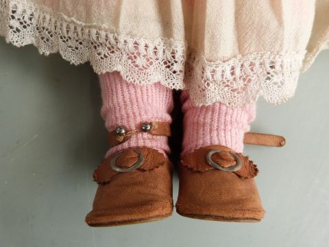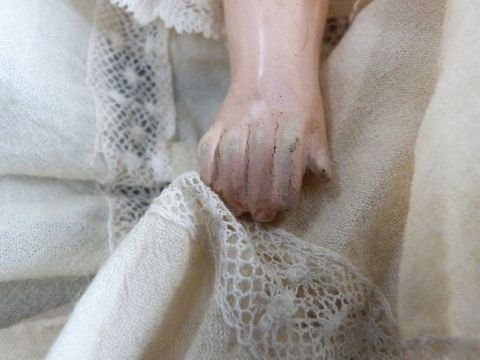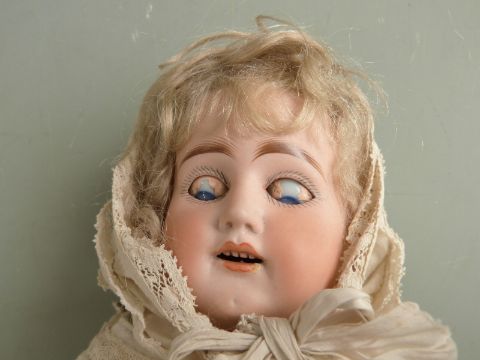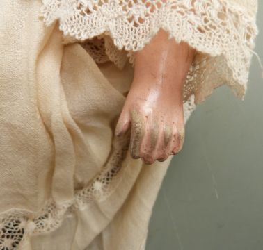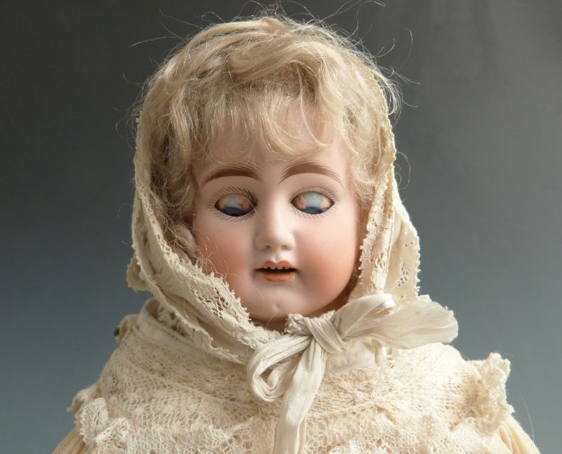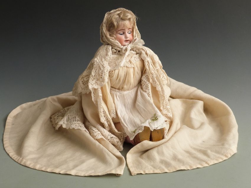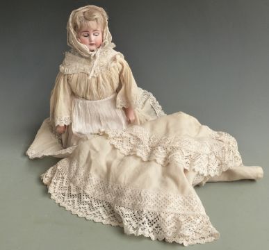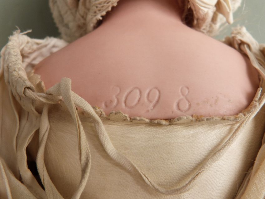 Continental bisque headed doll with open mouth, weighted blue eyes, short blonde hair and articulated composite and kid leather body, marked to the back of the neck '309 8', in lace decorated dress, 49cm tall.