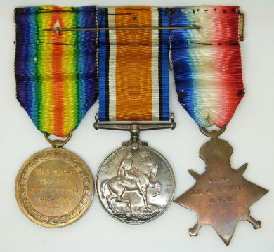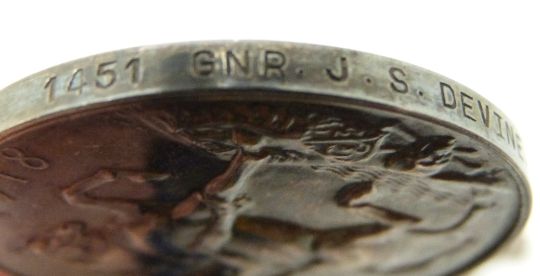 British Army WWI medals comprising 1914/1915 Star, War Medal and Victory Medal named to 1451 Gunner J S Devine, Royal Field Artillery