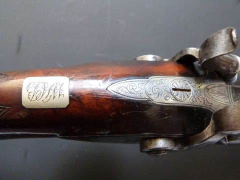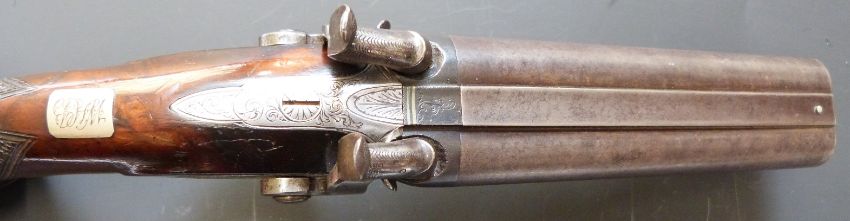 Keep and Hinkley approximately 28 bore double barrelled side by side percussion hammer action howdah pistol with named and engraved locks, engraved stylised dolphin hammers, pineapple finialled trigger guard, top plate and butt cap, chequered grip, captive ram-rod, wrist cartouche and 5.75 inch barrels, overall length 32cm.