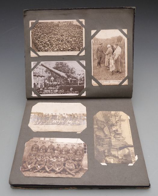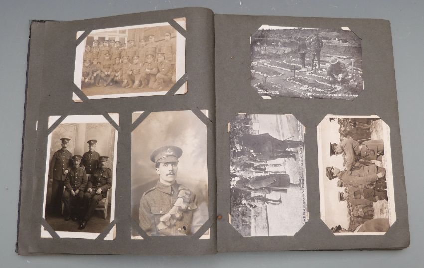 WWI postcard album containing approximately 100 mainly British Army Western Front cards, some in colour, including Northumberland Fusiliers, Wiltshire Fusiliers, Somme etc