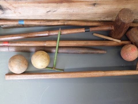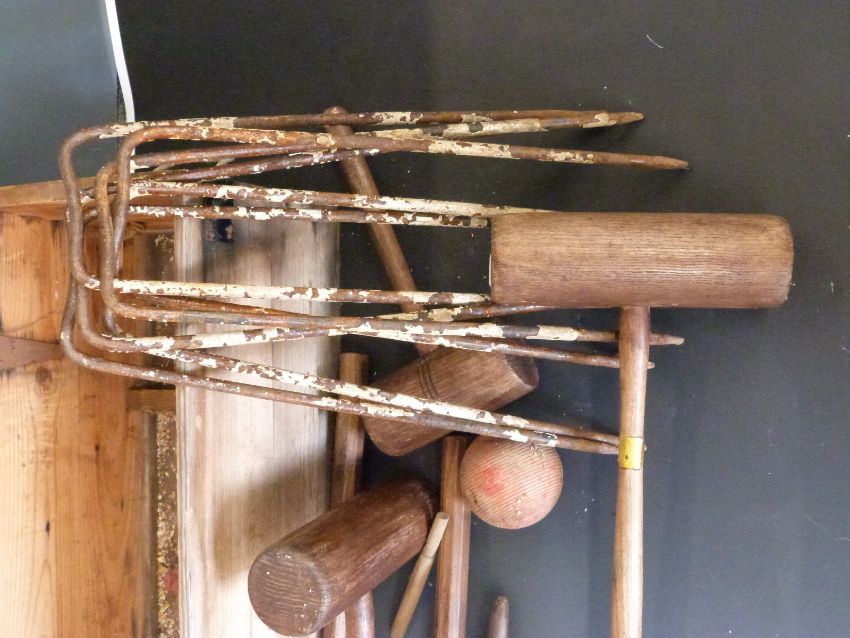 A vintage croquet set with turned oak/ash handles and wrought iron hoops, in original crate.