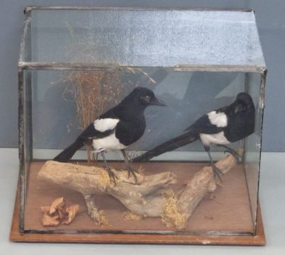 Taxidermy study of a pair of magpies in glass case, approximately 46x36x30cm