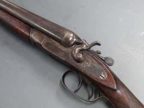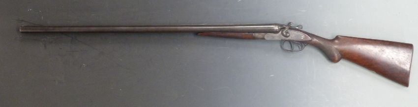 Midland Gun Co 12 bore side by side hammer action shotgun with engraved lock, hammers, trigger guard, underside and top plate, chequered semi-pistol grip and forend, vacant cartouche to the underside of the stock, double trigger and named 30 inch barrels, overall length 117.5cm, serial number 88727.  PLEASE NOTE THAT A VALID RELEVANT FIREARMS/SHOTGUN CERTIFICATE IS REQUIRED TO HANDLE/PURCHASE THIS ITEM.