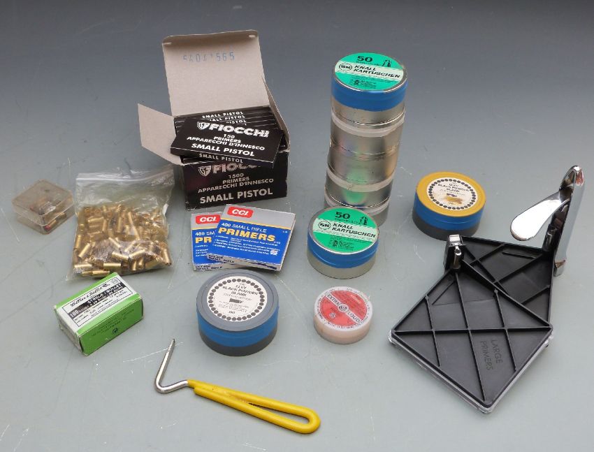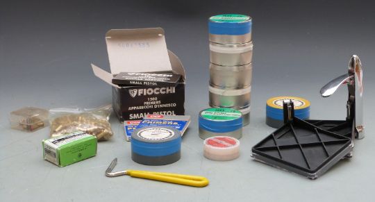 A collection of pistol re-loading equipment including Lee loading tools, 25 ACP unprimed brass cases, Eley 9mm and 6mm blanks, Fiocchi small pistol primers etc.