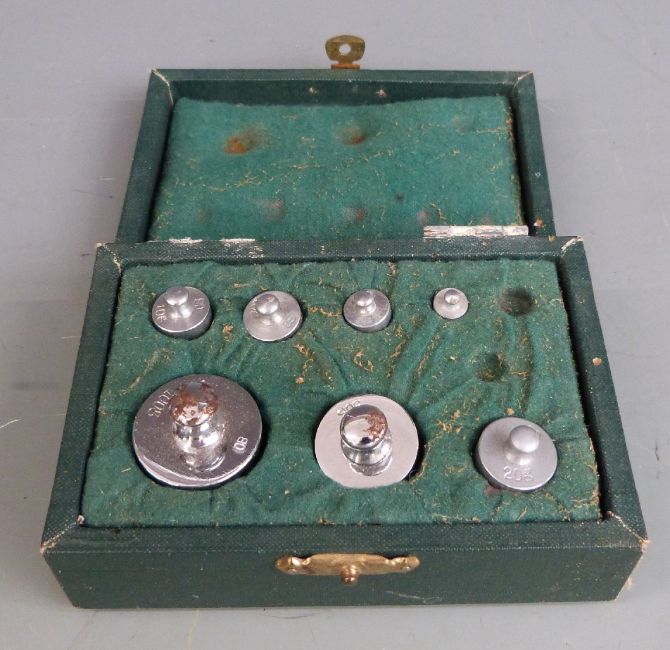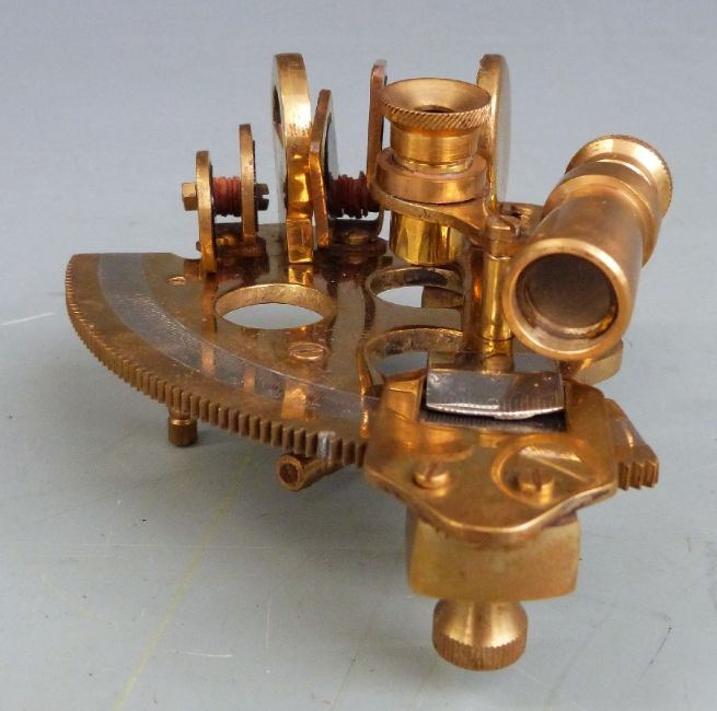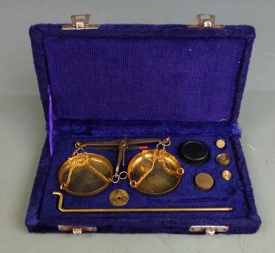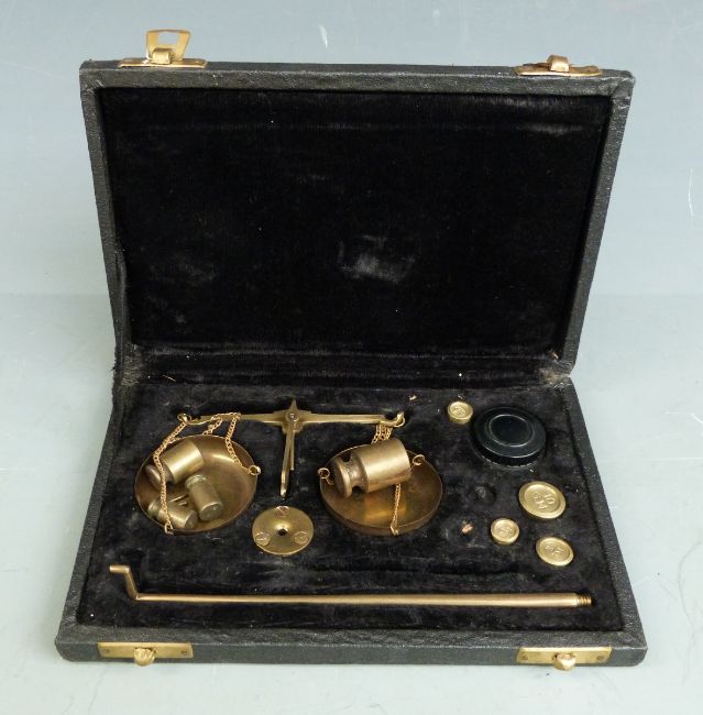Small cased brass sextant, two sets of beam scales, cased weights and a watchmaker's tool