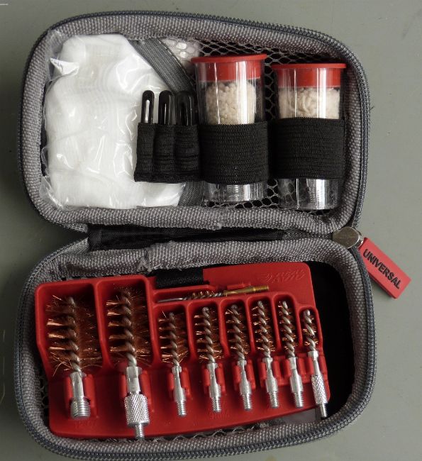 A collection of shotgun cleaning kit and accessories including Universal travelling cleaning kit, Hoppe's Bore Snake, recoil butt pads, Leatherman Bit Kit etc, some in original boxes