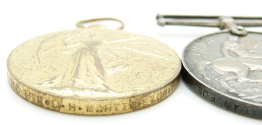British Army WWI medals comprising War Medal and Victory Medal named to 64763 Pte D H Martin, Lancashire Fusiliers