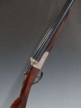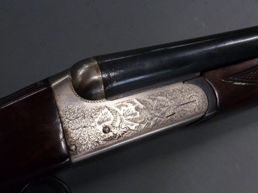 Gunmark Kestrel 20 bore side by side shotgun with engraved lock, trigger guard, underside and top plate, chequered grip and forend, double trigger and named 27 inch barrels, overall length 111cm, serial number 339511.  PLEASE NOTE THAT A VALID RELEVANT FIREARMS/SHOTGUN CERTIFICATE IS REQUIRED TO HANDLE/PURCHASE THIS ITEM.