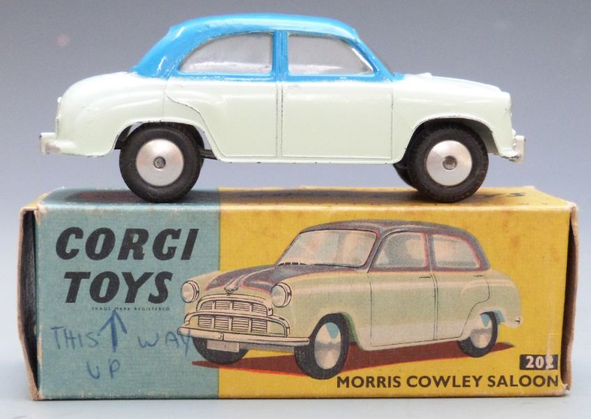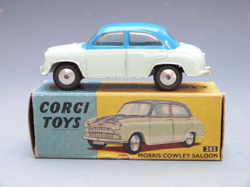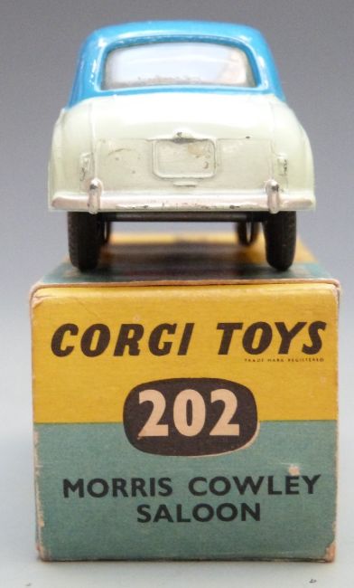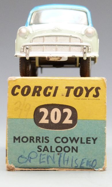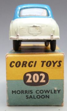 Corgi Toys diecast model Morris Cowley Saloon with pale green and blue body, 202, in original box.